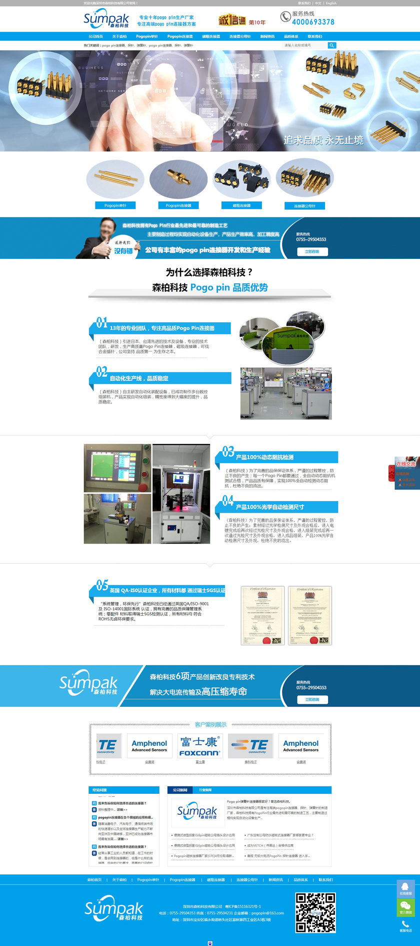 Project Description 深圳市森柏科技有限公司是专注高端pogo pin连接器、探针、弹簧针的制造厂家,森柏科技拥有Pogo Pin行业最先进和最可靠的制造工艺,主要制造过程均实现自动化设备生产,产品生产效率高,加工精度高,重要检测过程均采用自动化快速识别系统,大大降低了人为操作失误的风险,极大的提升了检测效率,工艺过程得到极大的改善和满足。因此产品质量和稳定性获得巨大突破。 Official website address 本溪http://www.zgsumpak.com I want to share
